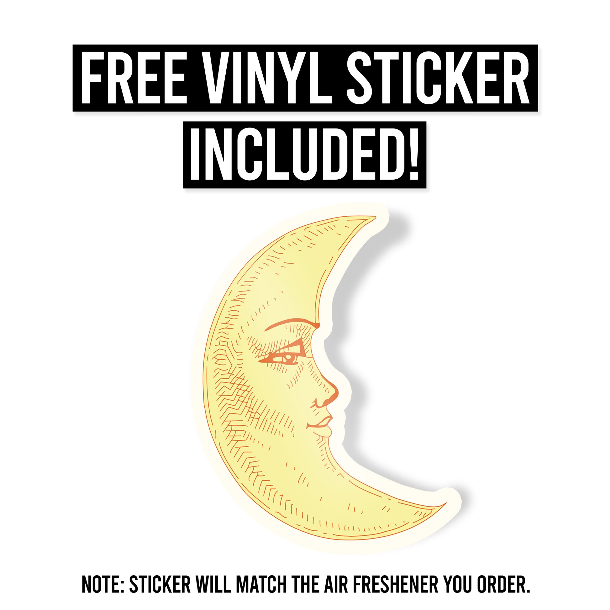 Custom die cut air freshener designed in the shape of a moon. FREE vinyl sticker included. Premium air fresheners that are made from high quality materials designed not only eliminate bad odors but also infuse your car with your favorite scents.