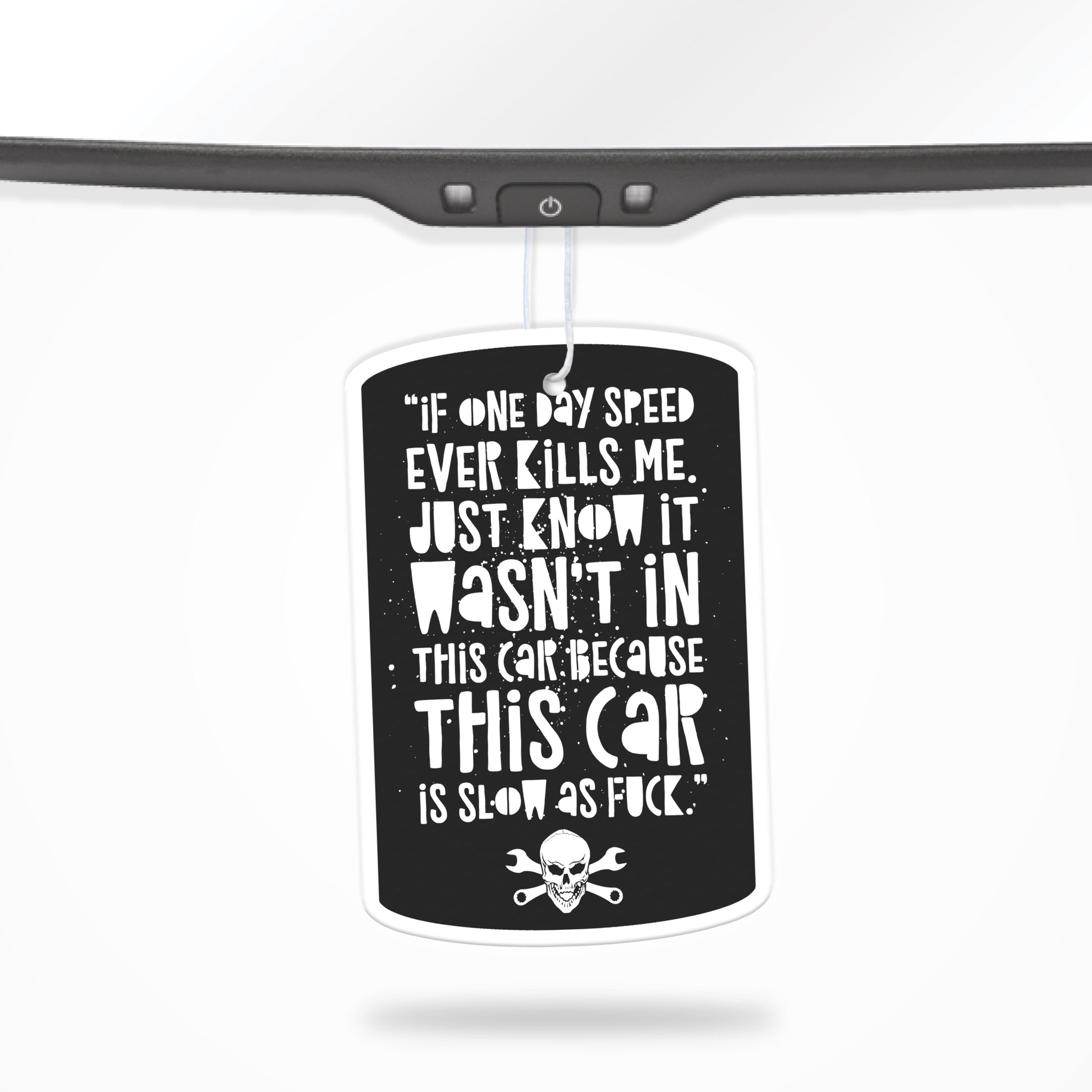 Custom die-cut air freshener featuring the TikTok phrase, "If speed ever kills me. Just know it wasn't in this car because this car is slow as fuck". FREE vinyl sticker included. Our premium air fresheners are made from high quality materials are designed to eliminate bad odors and infuse your car with your favorite scents.