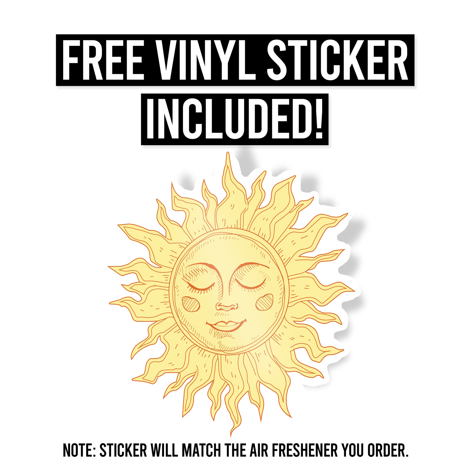 Custom die cut air freshener designed in the shape of a sun. FREE vinyl sticker included. Premium air fresheners that are made from high quality materials designed not only eliminate bad odors but also infuse your car with your favorite scents.